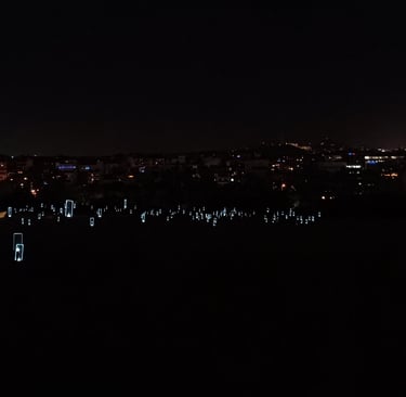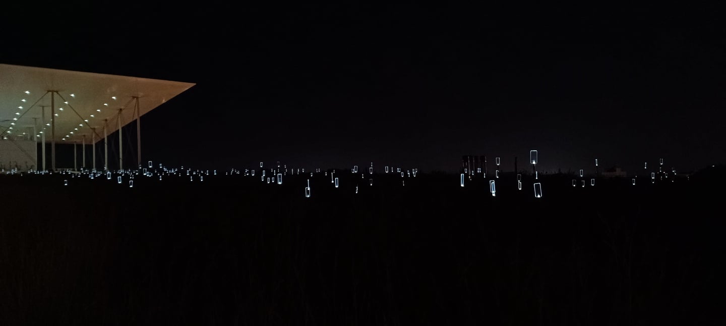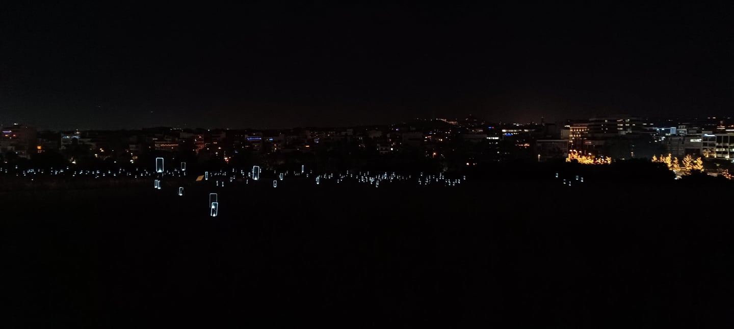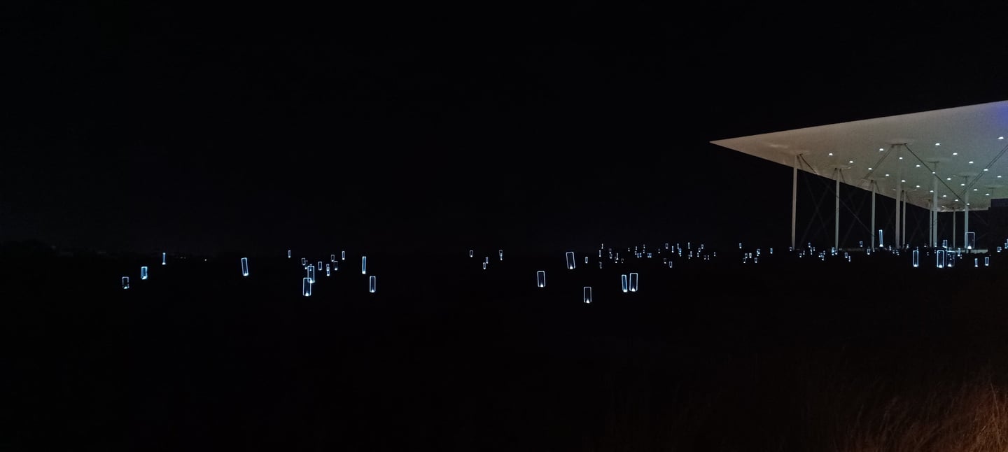 The inspiration for the luminous landscape created by Petros Dermatas for luminous dreams came from the image of lit lighters raised in the hands of audiences at concerts of the past, a sign of participation and interaction. Today mobile phones have taken the place of lighters at concerts.